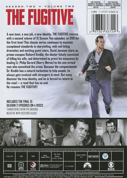Tuesday, February 15th, 2011: The day a classic was completed (on DVD). That was the date when CBS/Paramount released "THE FUGITIVE: THE FOURTH AND FINAL SEASON: VOLUME TWO" in a 4-Disc DVD set, which means that all 120 episodes of that 1963-1967 television series are now available to own.